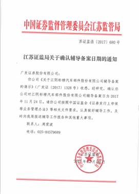 公司已收到江蘇證監(jiān)局關于確認輔導備案日期的通知,公司將會按照中國證監(jiān)會《證券發(fā)行上市保薦業(yè)務管理辦法》等相關文件要求,認真做好輔導工作,及時向江蘇證監(jiān)局報送輔導工作報告和其他重大事項。