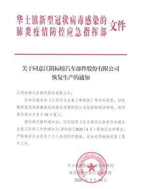 公司積極向江陰市政府申請復工,于正月十七接華士鎮(zhèn)新型冠狀病毒感染的肺炎疫情防控應急指揮部文件通知, 公司正式啟動了生產(chǎn)計劃編排、關(guān)鍵設(shè)備物料拉動和員工召回等各項具體工作,在全面做好工作區(qū)域消毒和員工防護的前提下,緊急開展復工,保證產(chǎn)品準時交付。